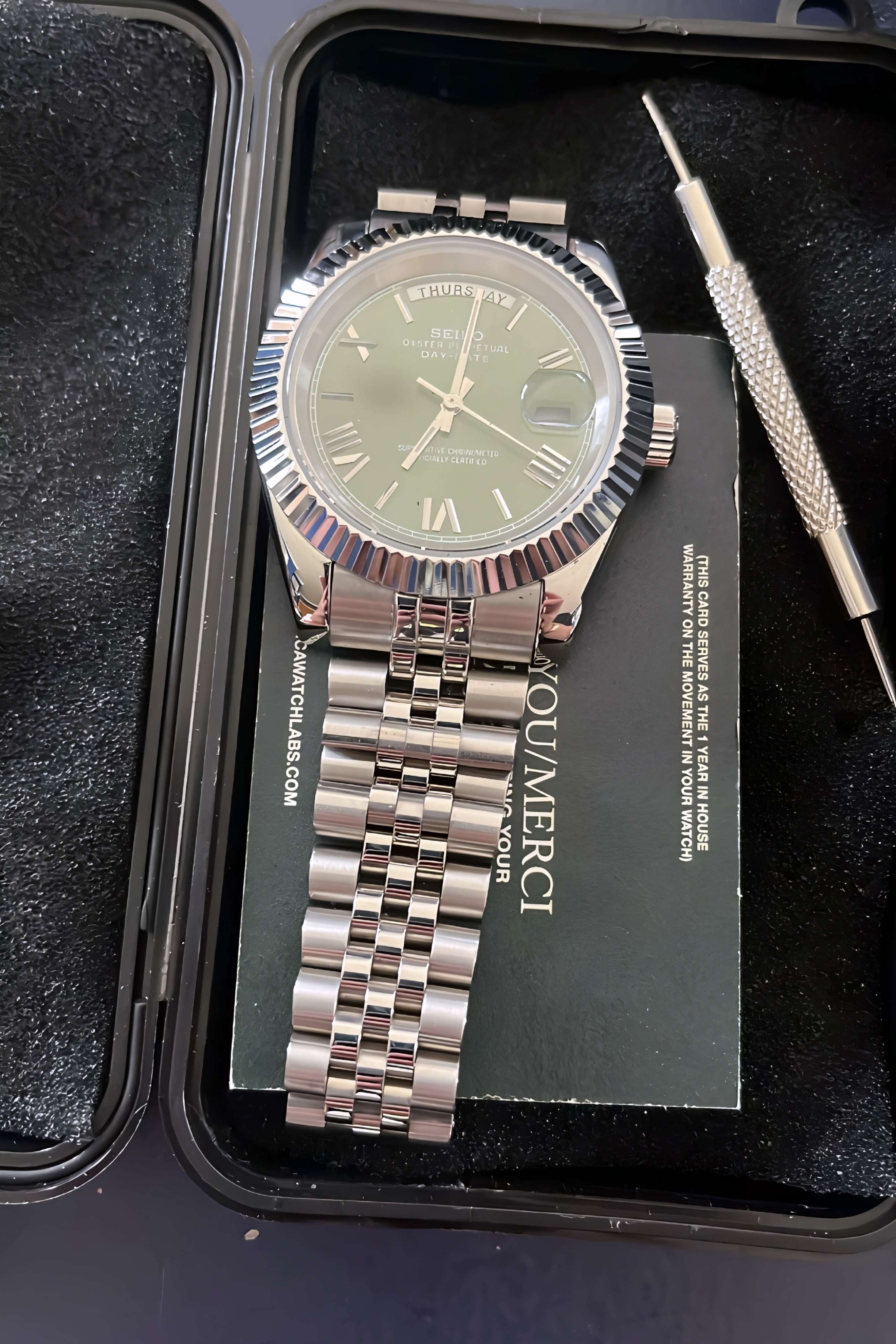 At CIRCA WATCH LABS, we offer a variety of Seiko mod styles for sale such as DAYDATE, NAUTILUS, DATEJUST and SANTOS MODS. Each watch is made using Seiko TMI movements and can be customized with various aftermarket dials, bezels, and straps to suit your needs.