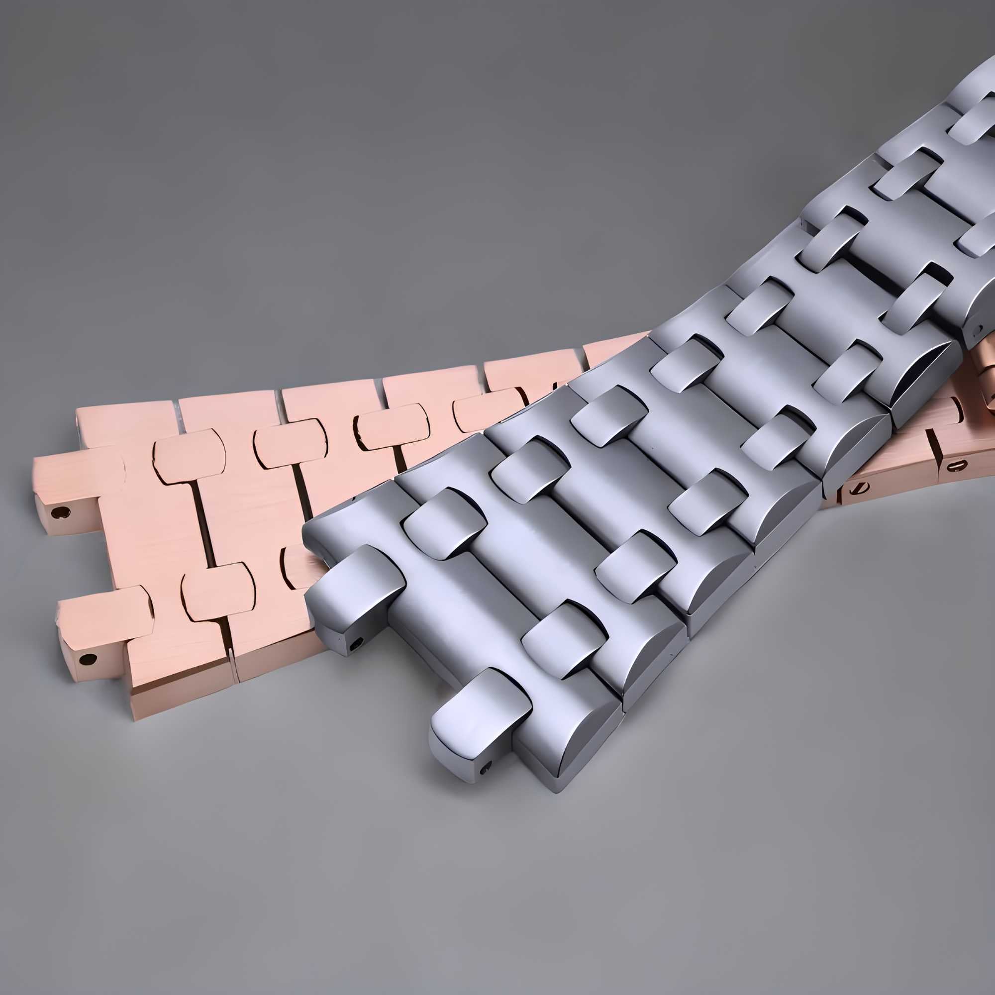 The aftermarket bracelet style features a distinctive mix of brushed and polished links, creating a dynamic texture that is visually striking. The design of the bracelet, with its perfectly aligned, interconnected links, ensures both flexibility and comfort, allowing the watch to sit securely on the wrist without feeling rigid or uncomfortable. the bracelet’s smooth, tapering form not only enhances the watch’s sleek profile but also gives it an elegant, refined look.