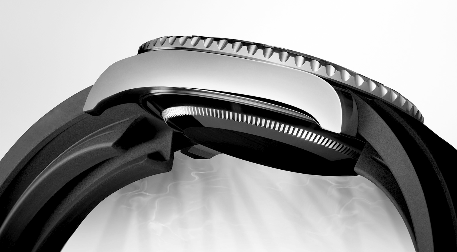 Developed with high-density rubber giving it shape and structural integrity. The Oyster flex homage bracelet boasts the same durability of a metal bracelet, with the comfort of a rubber strap. It also features a tiered design that lifts the watch up and away from the wrist, providing airflow and comfort, which are commonly lacking in other sport bands.
